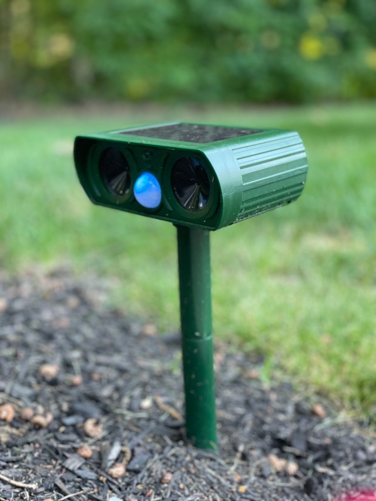 Originally we bought these because we had a vole problem, but ultimately I think it is protecting our plants from everything. It projects a high pitched beep (this is annoying at first, but you get used to it) and it also has a red light. So far my lovely plants where these are located have not been touched by the deer and the voles have gone away. We did notice the voles came back for a little bit, but they eventually went away again.